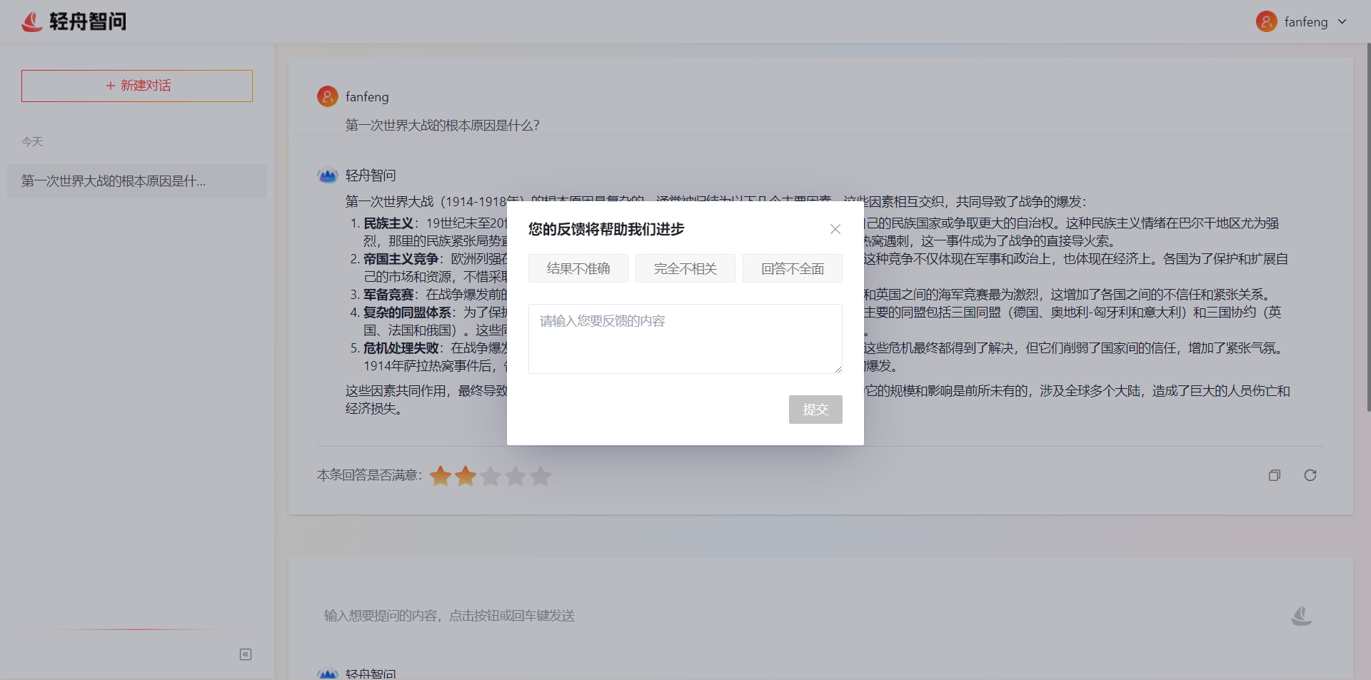 答案反馈:支持对回答反馈1~5评分,用于帮助轻舟智问优化回答效果。