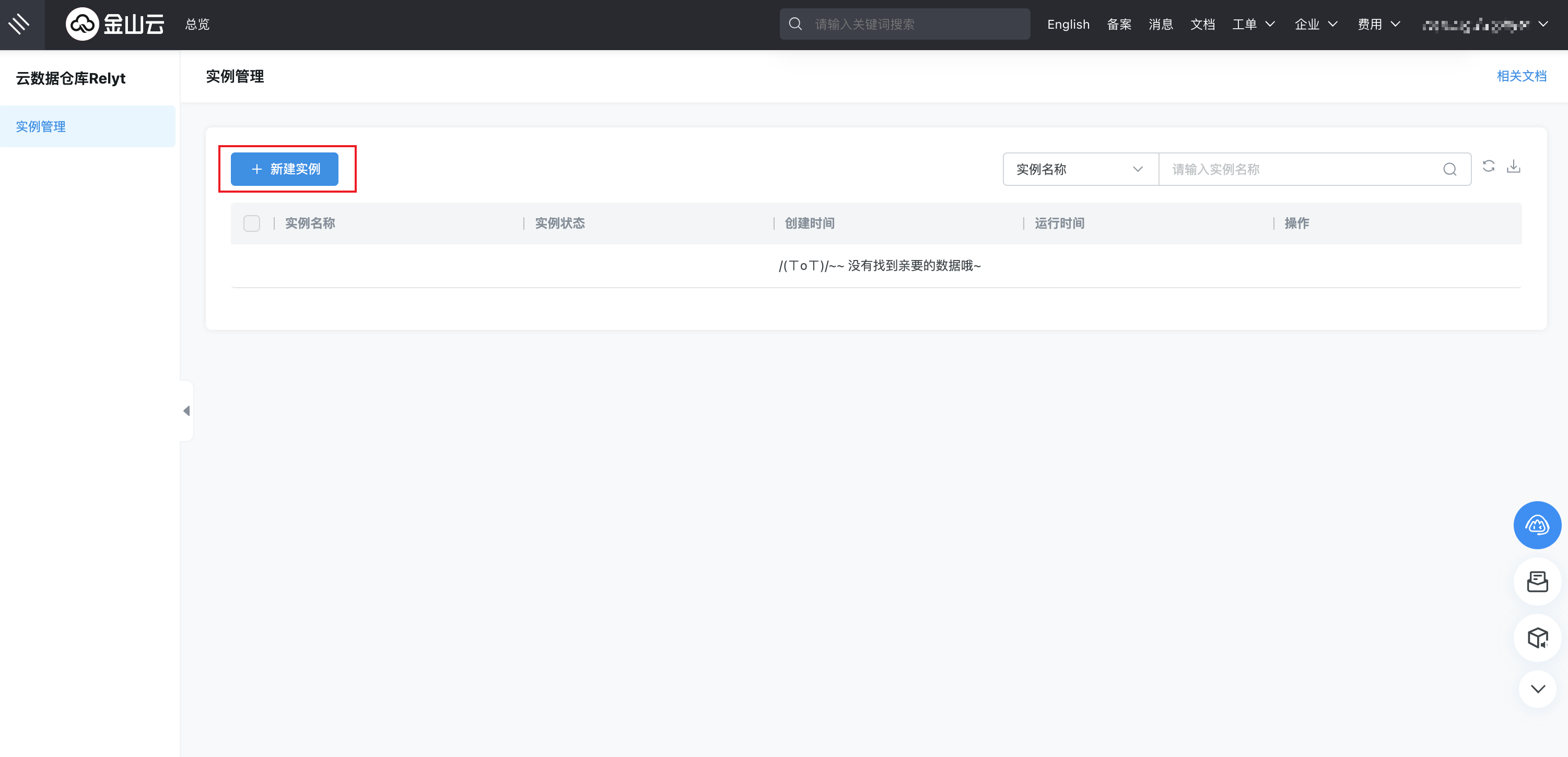 3. 在 实例管理 页面,点击 + 创建实例