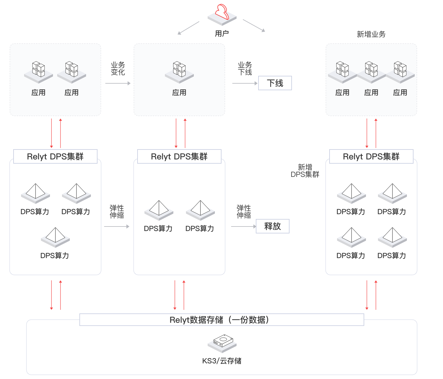 Relyt 提供了卓越的实时性、弹性和可靠性,采用“存算分离 + SHARED-DATA”架构, 计算资源实例 DPS 集群支持按需部署、按需扩展、自动启停,以及以查询为粒度的自适应计算资源扩展,灵活应对业务变化的敏捷需求。