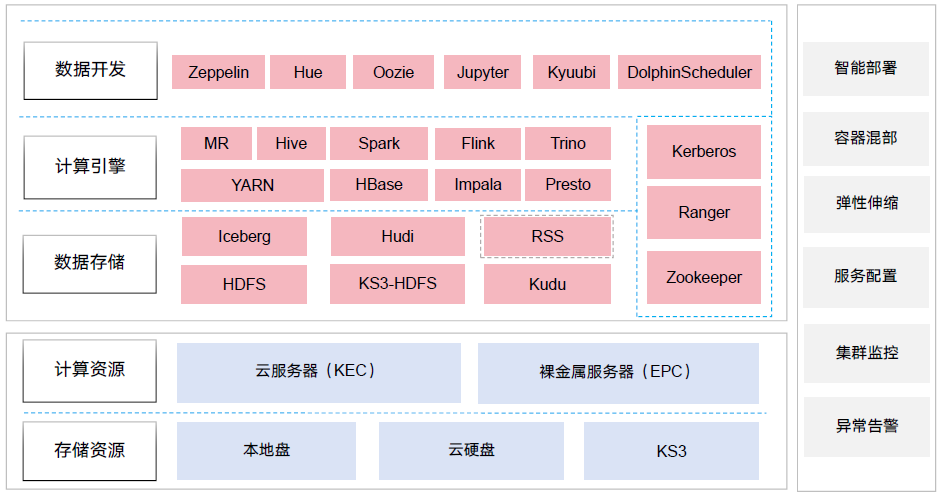 KMR基于Hadoop生态系统,可无缝对接金山云对象存储(Kingsoft Cloud Standard Storage Service,简称KS3)和关系型数据库服务(Relational Database Service,简称RDS),着力于方便快捷的数据分析与存储,方便数据在多个系统间的共享和传输。KMR完全兼容开源系统,并在基础上强化,监控能力的整合加强。随着Hadoop社区发展生态组件不断扩充,KMR能力随之提升。