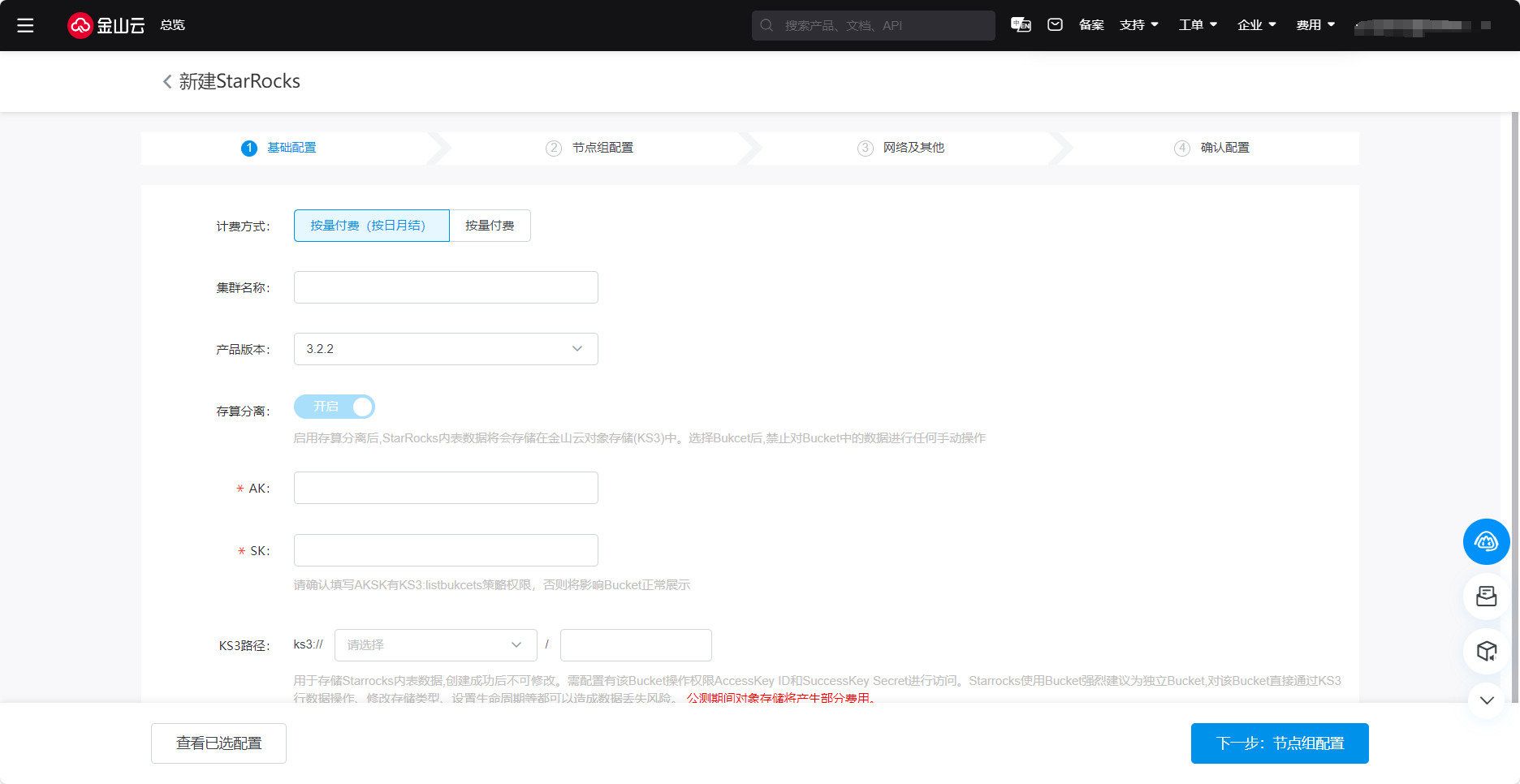 启用存算分离后,StarRocks内表数据将会存储在金山云对象存储(KS3)中。选择Bucket后,禁止对Bucket中的数据进行任何手动操作。