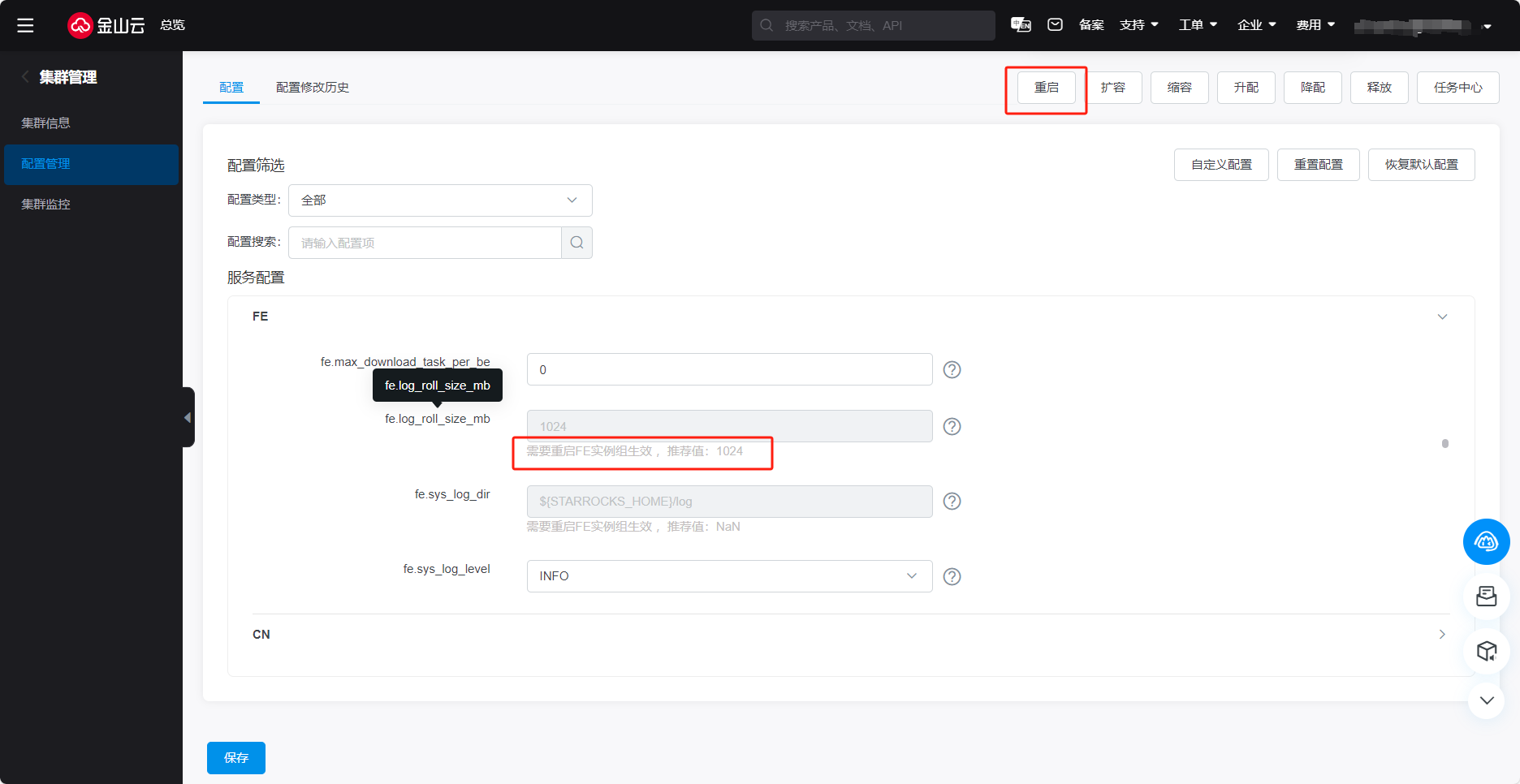 对于需要重启实例组生效的配置,您需要在修改配置,点击保存之后点击上方重启按钮重启实例