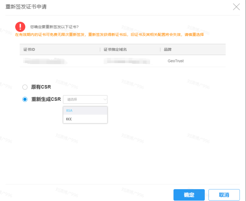 不支持多种算法的证书可选择原有CSR和重新生成CSR。