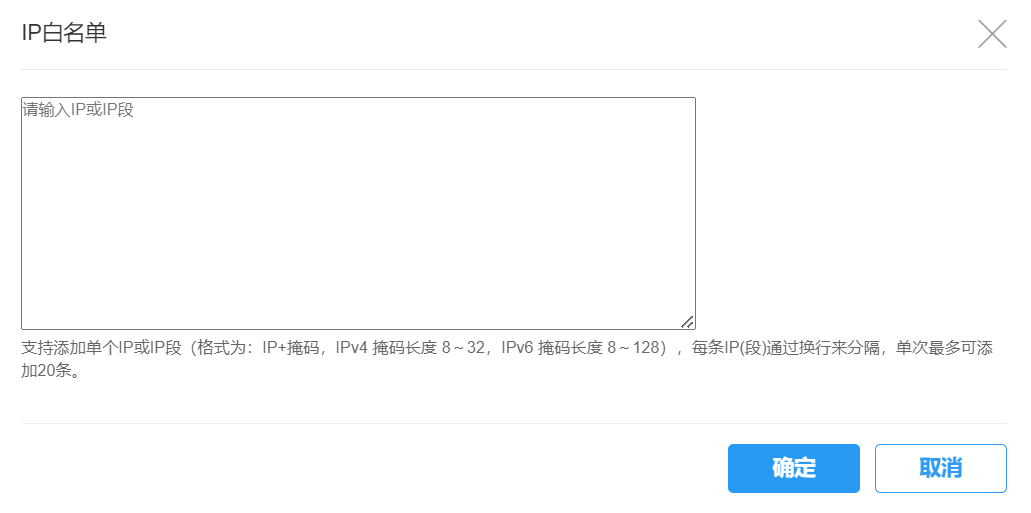 在输入框内添加IP,支持添加单个IP或IP段(格式为:IP+掩码,IPv4 掩码长度 8~32,IPv6 掩码长度 8~128),每条IP(段)通过换行来分隔,单次最多可添加20条,点击确定即可添加。