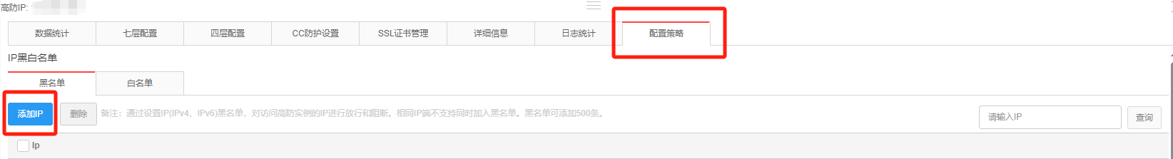 在底部滑出面板中选择配置策略页签,选择黑名单/白名单,单击添加IP按钮。