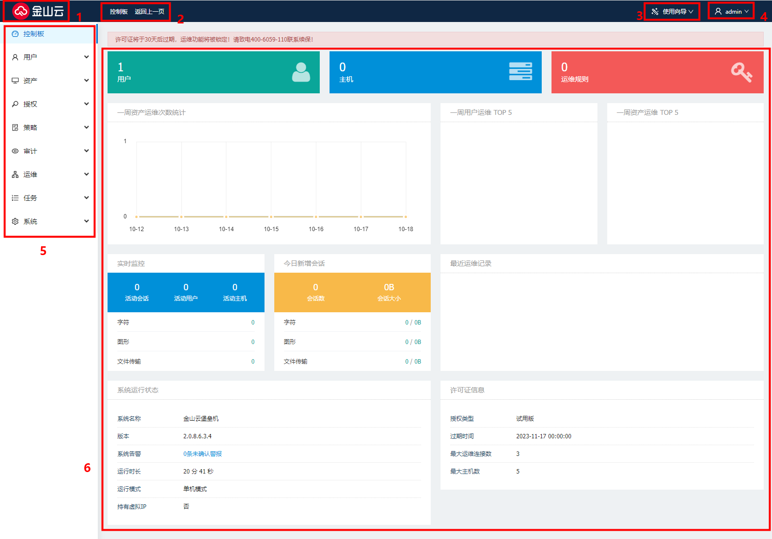 云堡垒机提供可视化、简洁、易操作的Web页面,包含6个部分,如下图。