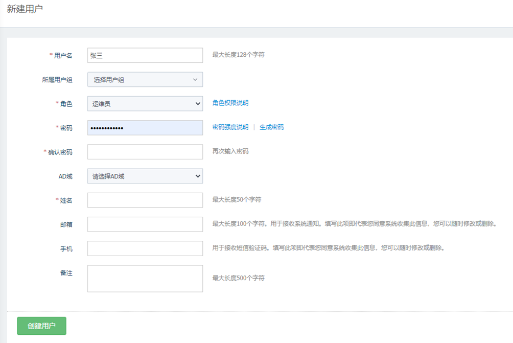 所属用户组 | 选择用户所属的用户组,用户组需提前在用户组管理模块中创建。 |