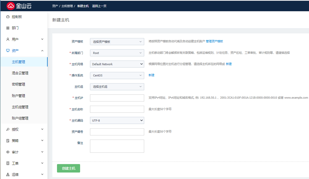 参见下表说明,配置主机信息,点击<创建主机>,完成新建主机。新建主机后,请参见添加主机账户章节说明给主机添加账户。
