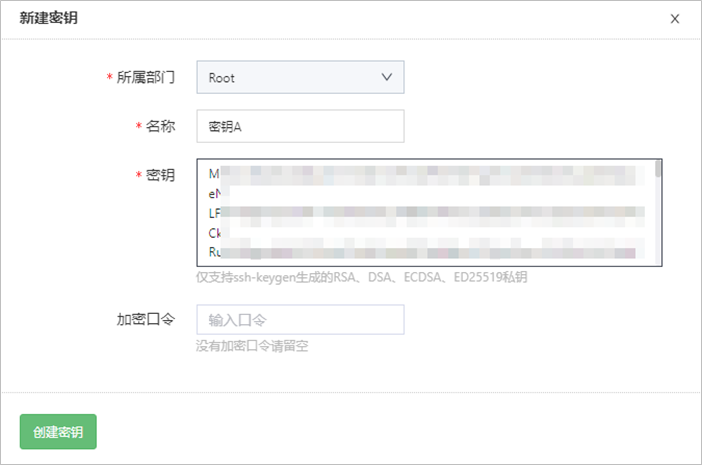 密钥 | 输入SSH私钥内容,仅支持ssh-keygen生成的RSA、DSA、ECDSA、ED25519私钥。 |