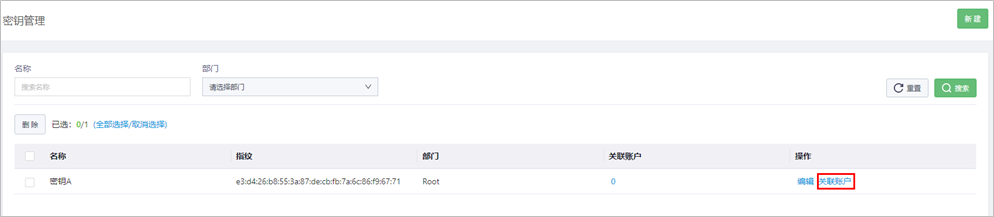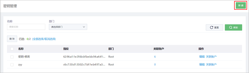 所属部门 | 选择密钥的所属部门。若没有此配置项,若没有此配置项,请确认是否已开启部门功能,详细操作请参见部门管理;部门需提前配置。 |