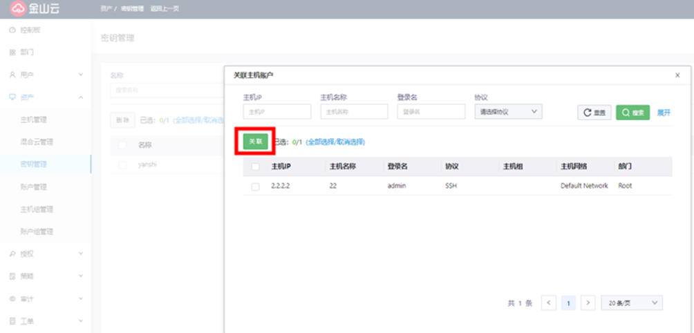 将创建的密钥关联到主机账户中,运维员选择该账户登录主机时,会通过SSH密钥方式访问主机。
