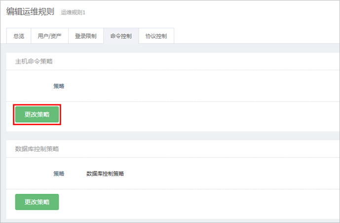 点击运维规则名称,进入总览页面,选择命令控制页签,进入命令控制页面,点击<更改策略>。