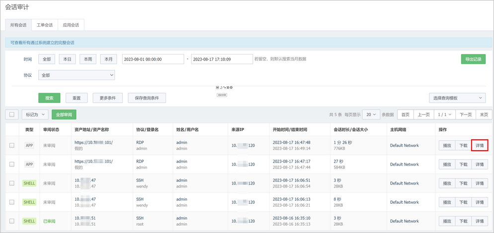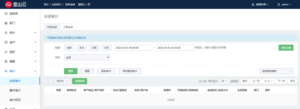 所有会话:可查看所有运维会话记录,包括主机运维会话、数据库运维会话、工单运维会话。