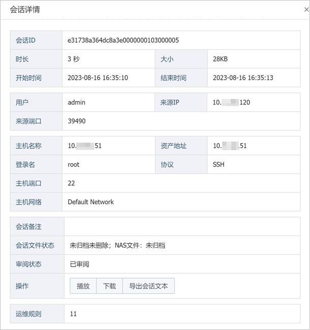 当运维员对资产运维结束后,系统会产生相应的运维会话记录并显示在会话审计页面中,授权的审计员可通过播放会话记录,查看会话内容,审计运维过程,从而定位故障和追溯故障根源。支持以所有会话、工单会话和会话三个维度查看运维会话内容。
