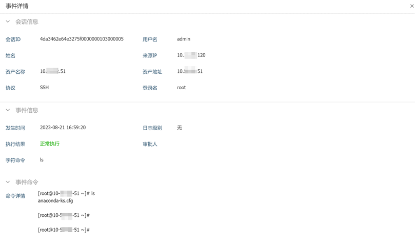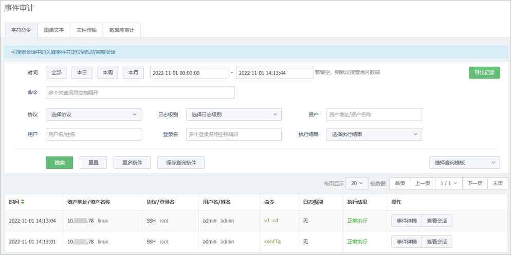 当运维员对资产运维结束后,系统会将运维过程中触发的字符命令、图像文字、文件传输和数据库审计等操作产生相应的事件记录,并显示在事件审计的对应页签中,授权的审计员可通过审计该事件详情,定位故障和追溯故障根源。