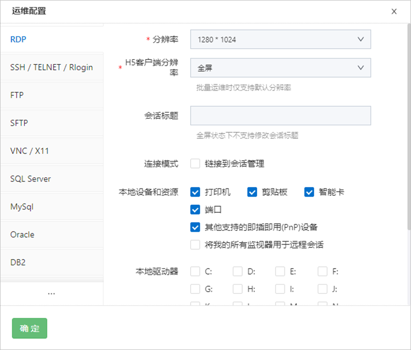 本地驱动器 | 选择RDP协议运维时允许映射的盘符。 | |