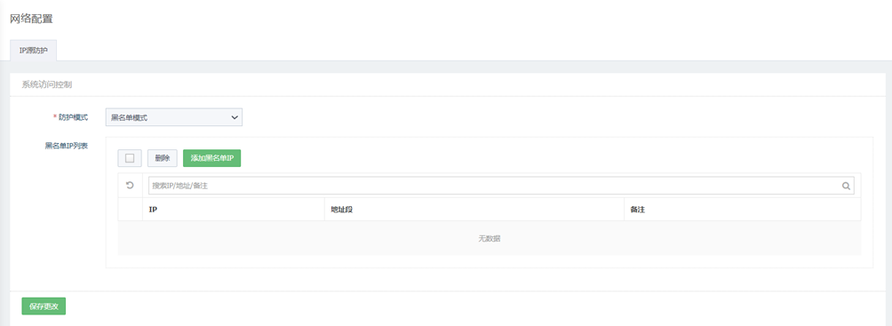 选择防护模式,更新黑/白名单IP列表,点击<保存更改>。