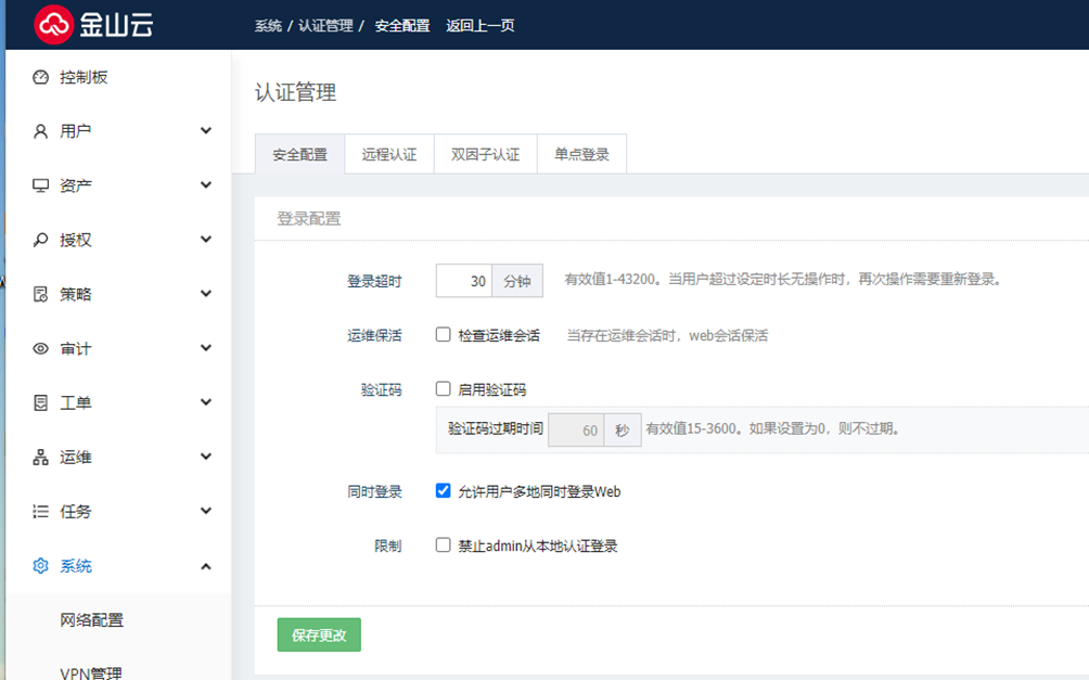 在登录配置区域,参见下表说明配置各项参数,点击<保存更改>。