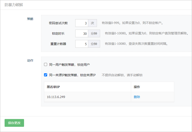 2. 防暴力破解区域,参见下表说明配置各项参数,点击<保存更改>。