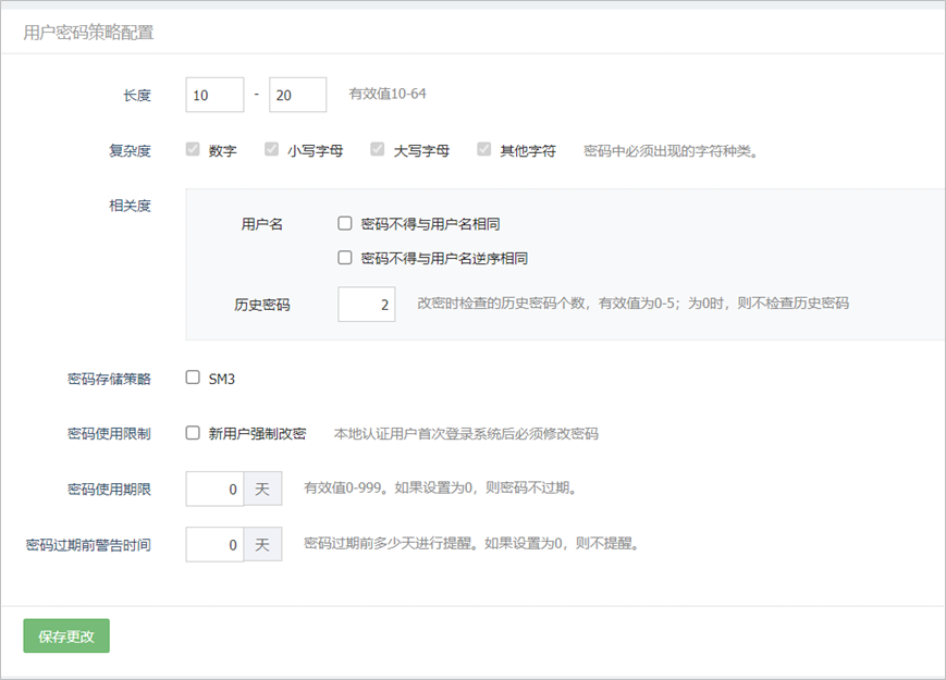 密码存储策略 | 勾选后,采用SM3存储用户密码。 |