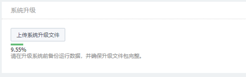 在系统升级区域,点击<上传系统升级文件>,选择并上传升级包文件。