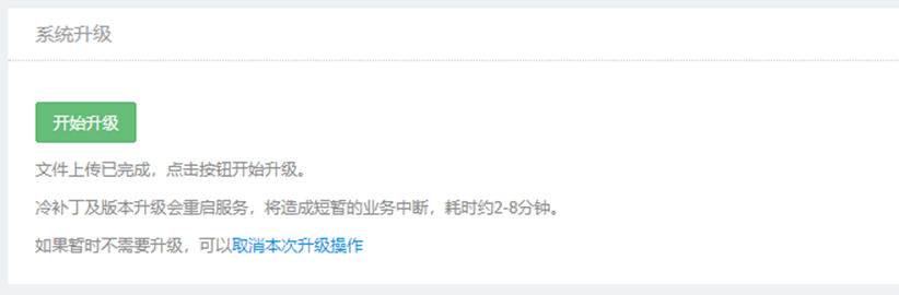此过程耗时约2-8分钟,升级完成后会重启系统服务,将造成短暂的业务中断,所有运维连接会被断开,Web登录会话会退出,待升级完成后,刷新Web页面,显示登录页面即升级成功。
