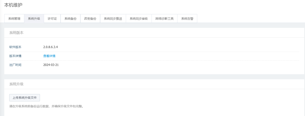 在系统菜单栏选择“系统>本机维护”,进入本机维护页面,选择系统升级页签,可查看系统当前的版本信息。