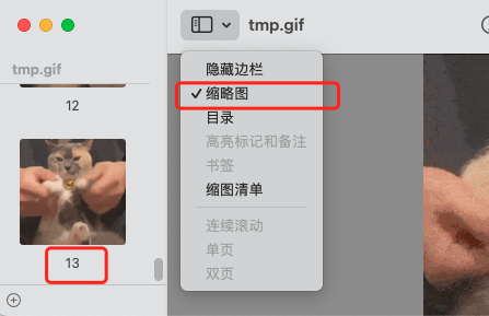 MacOS 中可以使用自带的预览打开图片,并打开缩略图边栏,将滚动条拉倒最底部,即可看到帧数。