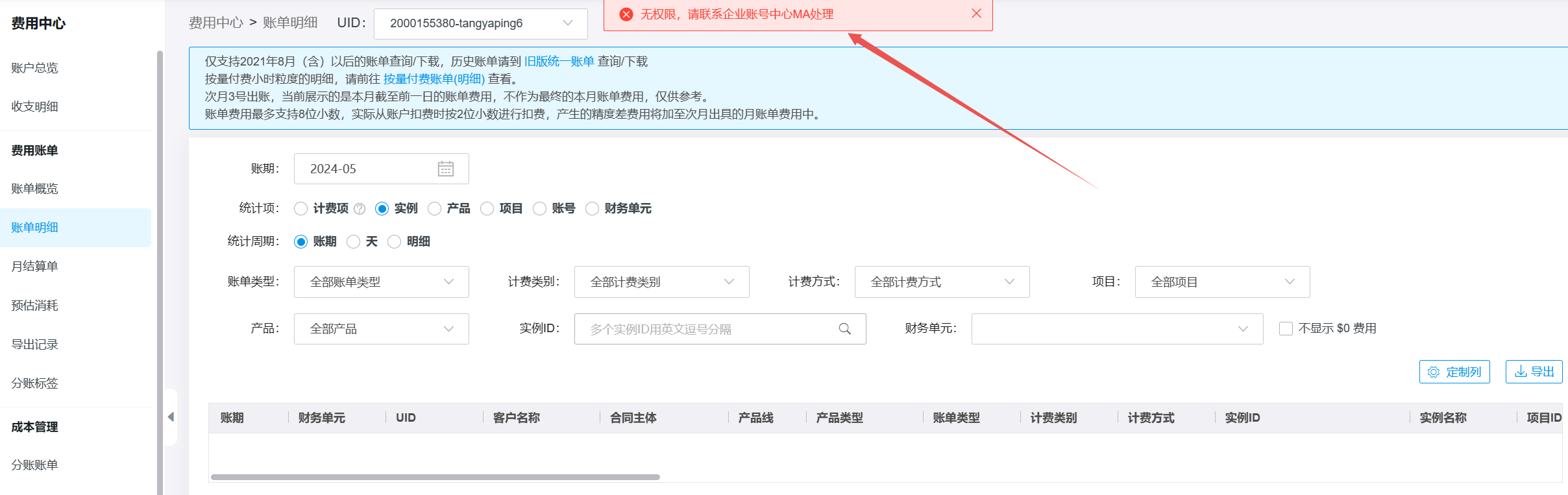被配置了成员类角色的账号登录费用中心,根据企业账号中心配置的组织目录、角色权限,账单总览、账单明细、月结算单等将会被禁止