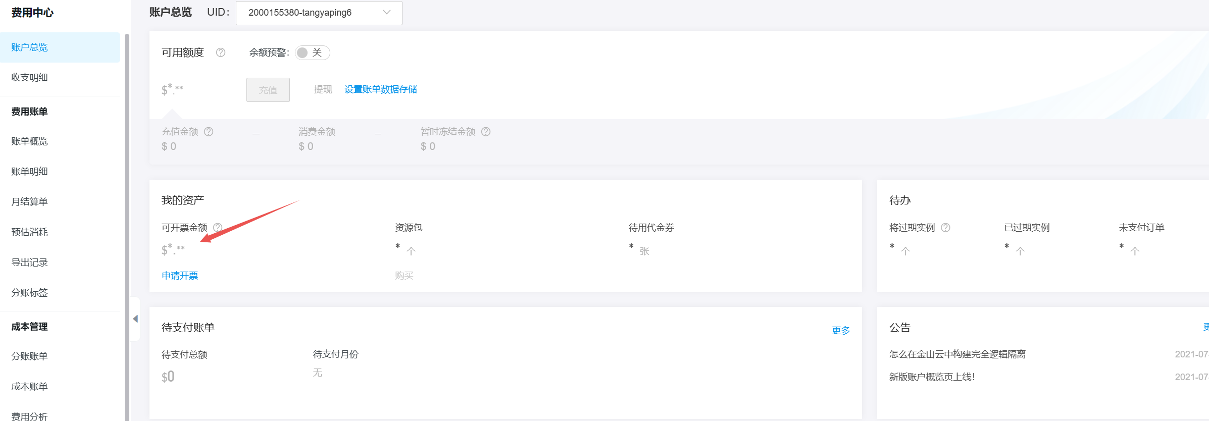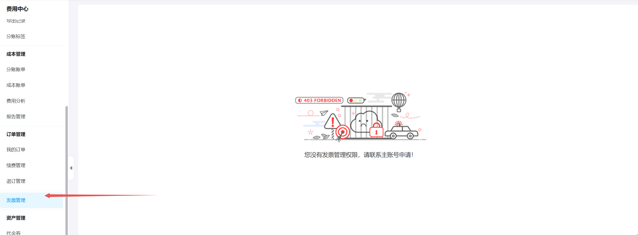 被配置了成员类角色的账号登录费用中心,根据企业账号中心配置的组织目录、角色权限,发票抬头、开票、退票等将会被禁止