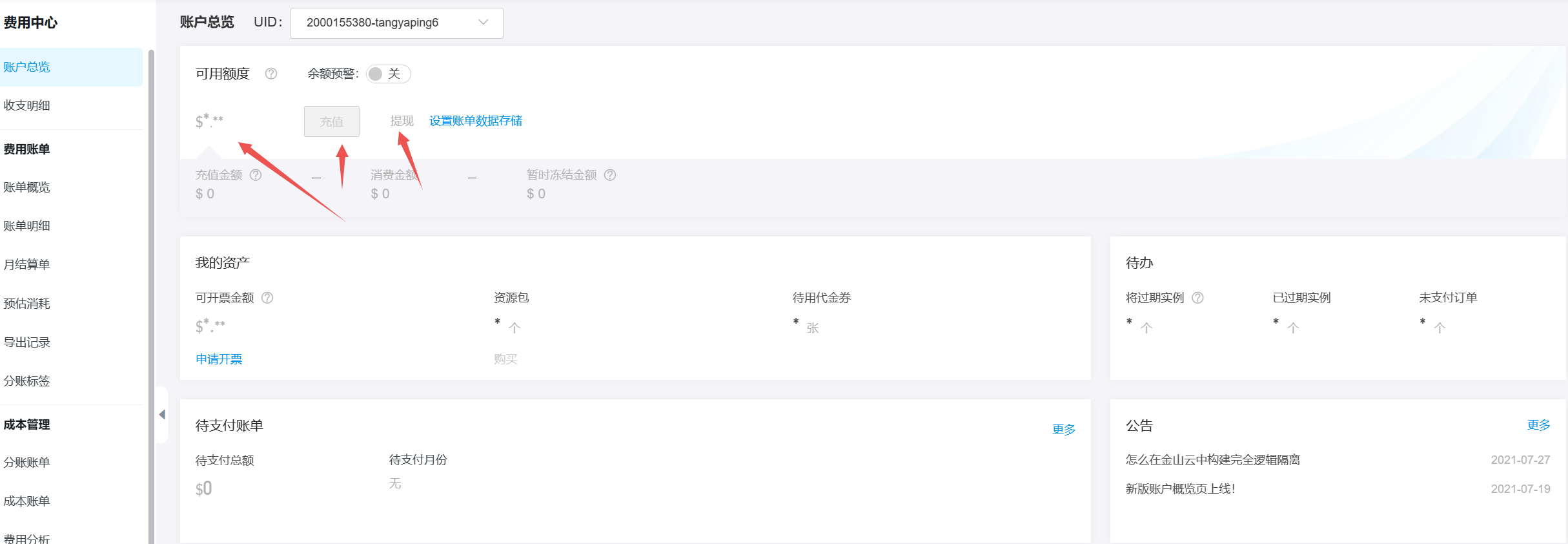 被配置了成员类角色的账号登录费用中心,根据企业账号中心配置的组织目录、角色权限,充值、提现、代金券、资源包等将会被禁止