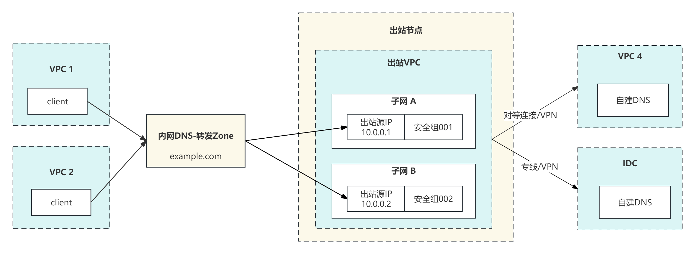 出站VPC把 DNS 查询请求通过专线、VPN或对等连接转发到自建 DNS。
