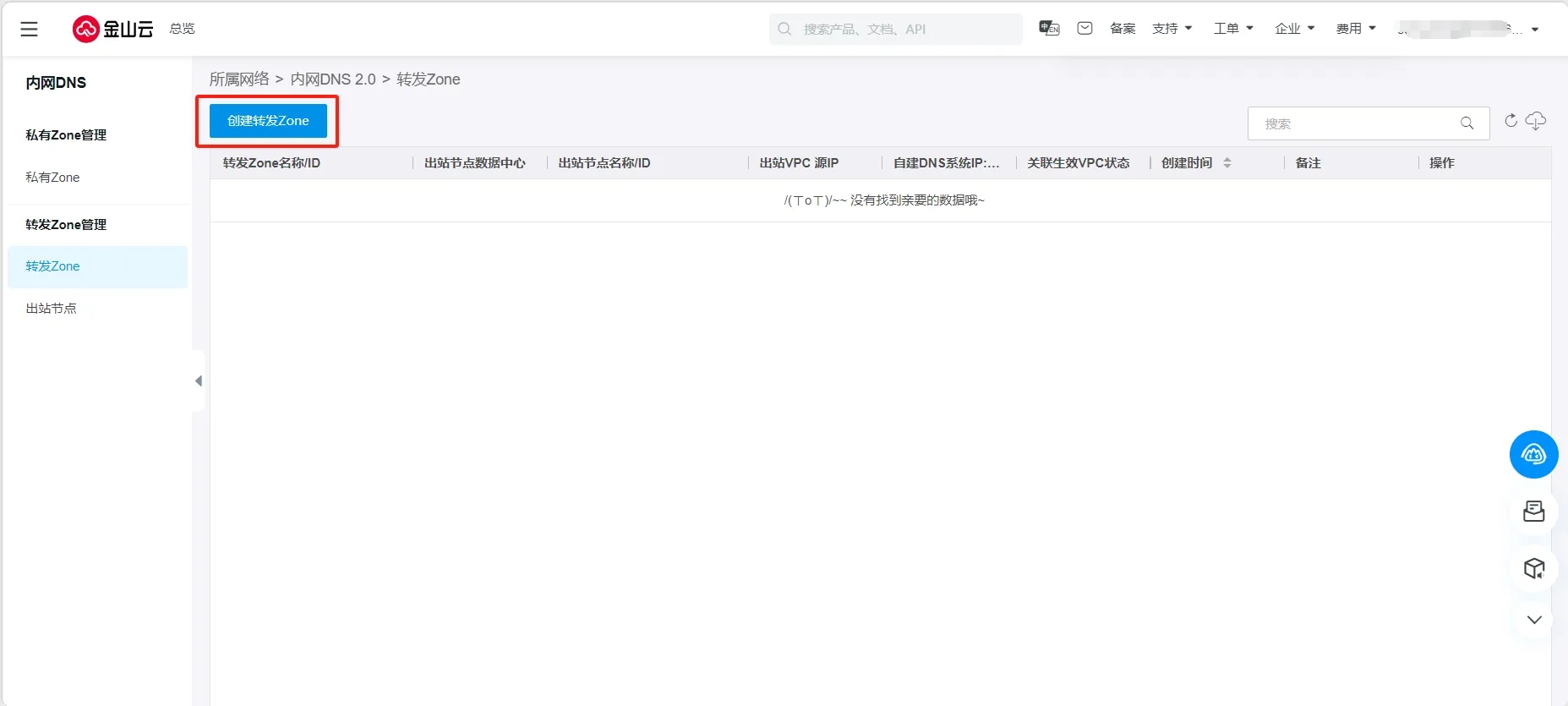登录 内网DNS控制台,进入 转发Zone管理 -转发Zone列表页。