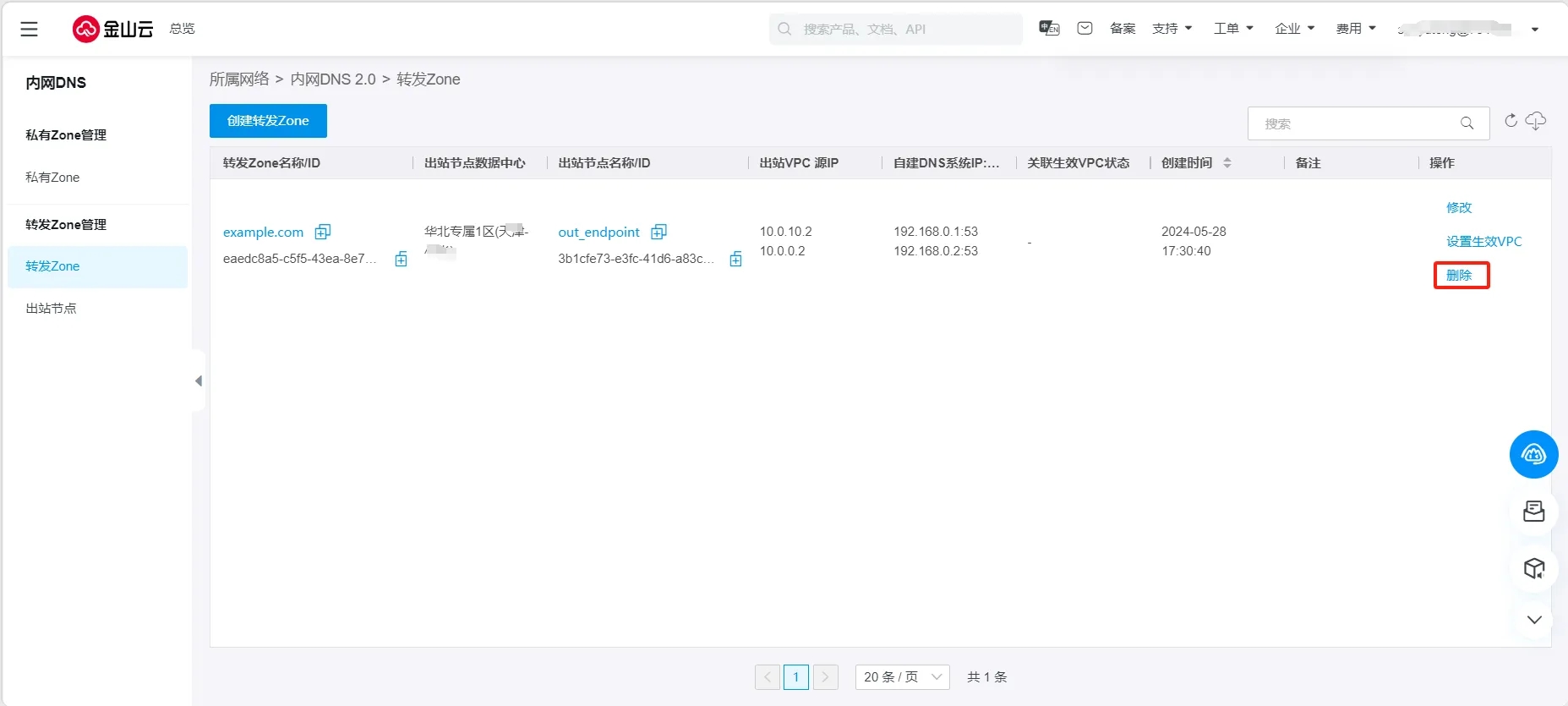 登录 内网DNS控制台,进入 转发Zone管理 - 出站节点列表页。