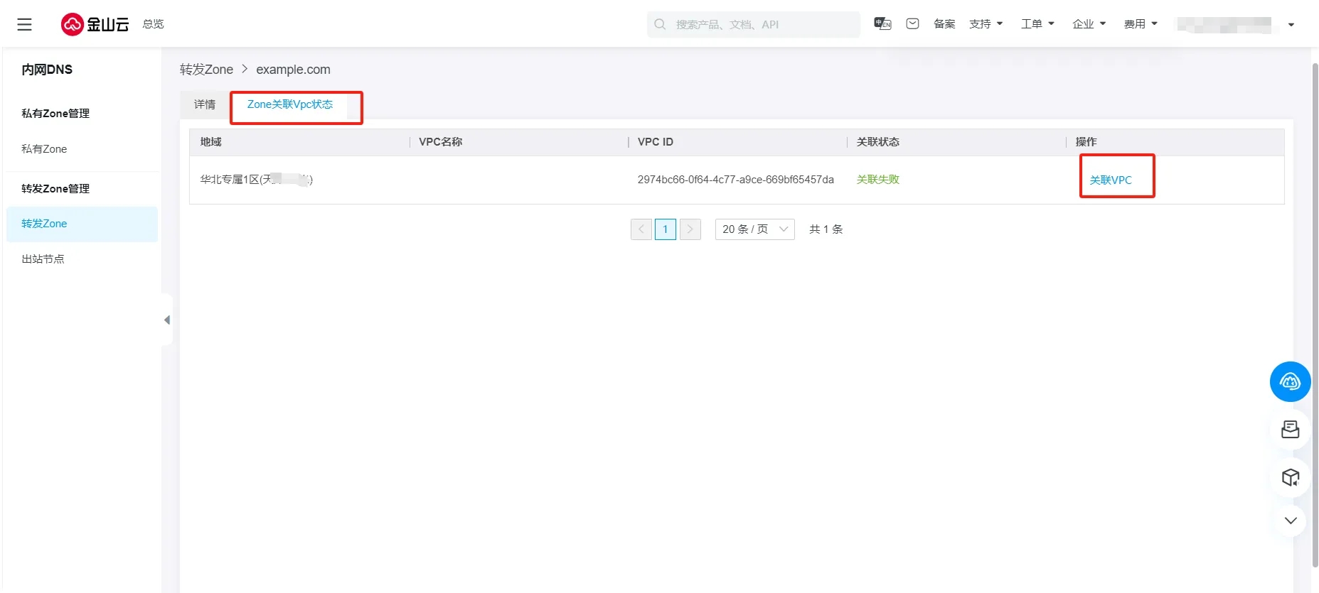 进入Zone关联VPC详情页,可查看VPC关联状态。如果关联失败,可点击 关联VPC 按钮,再次触发关联。如多次关联仍失败,请联系售后处理。