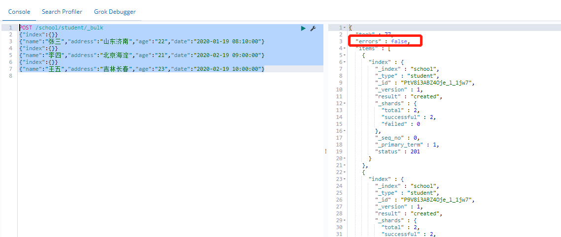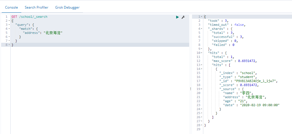 {"name":"王五","address":"吉林长春","age":"23","date":"2020-02-19 10:00:00"}GET /school/_search