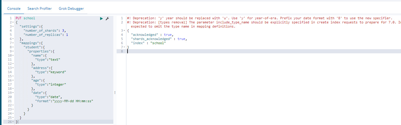 在Kibana控制台中,创建一个名称为school的索引,类型为student,包含4个字段,分别是name、address、age和date。关于字段类型说明,可查看官方文档 Field Datatypes。