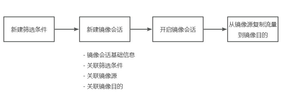 镜像会话:由筛选条件、镜像源、镜像目的组成,通过在镜像会话中关联筛选条件,将镜像源接收或发送的符合条件的流量复制到镜像目的的实例。