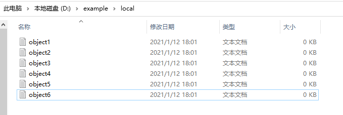 如下所示的示例中, 准备迁移D:\example\local\ 目录下的六个文件。