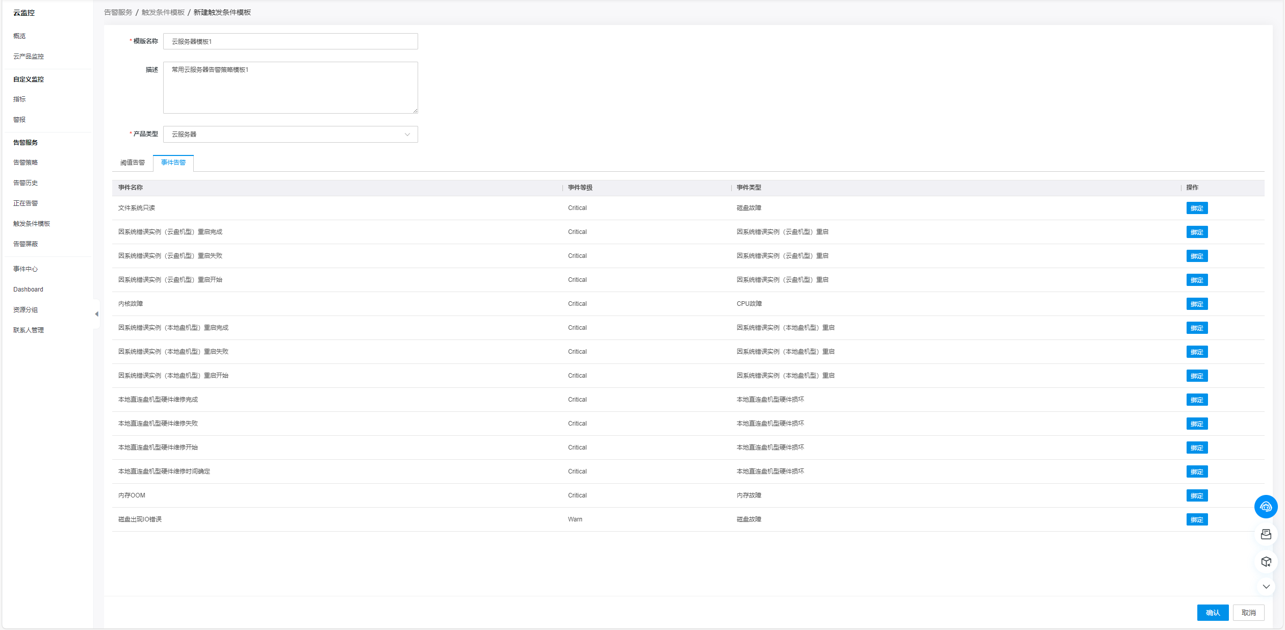 而设置事件告警模板需查看事件列表,对事件做绑定。
