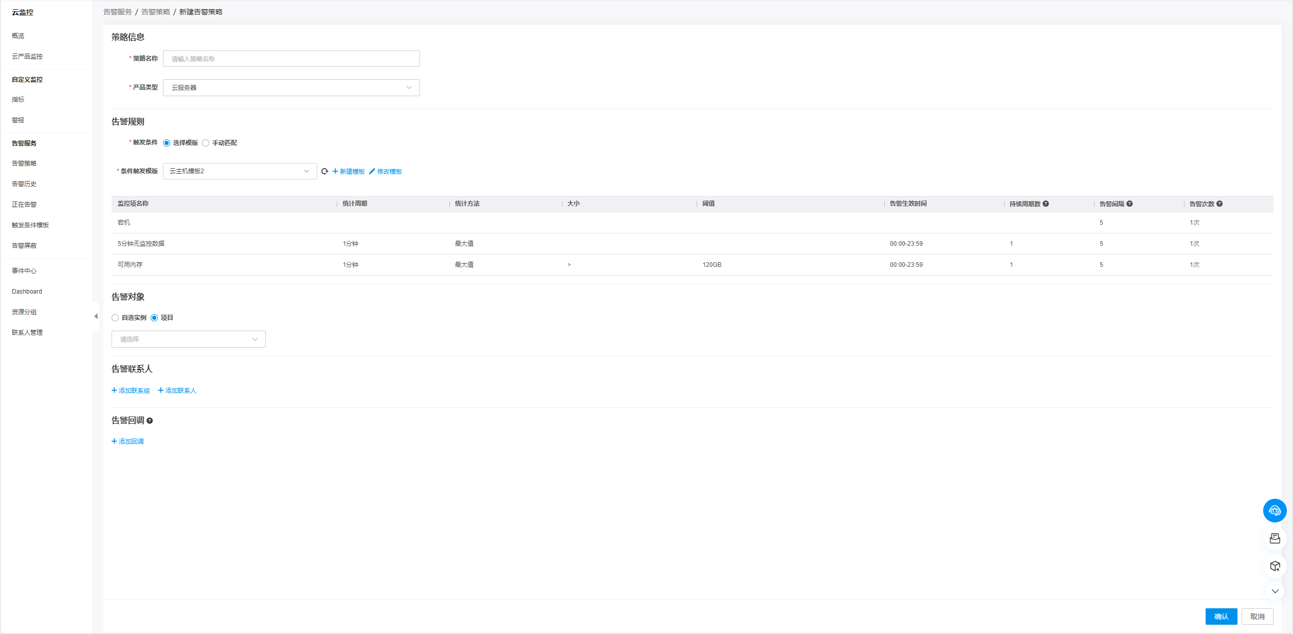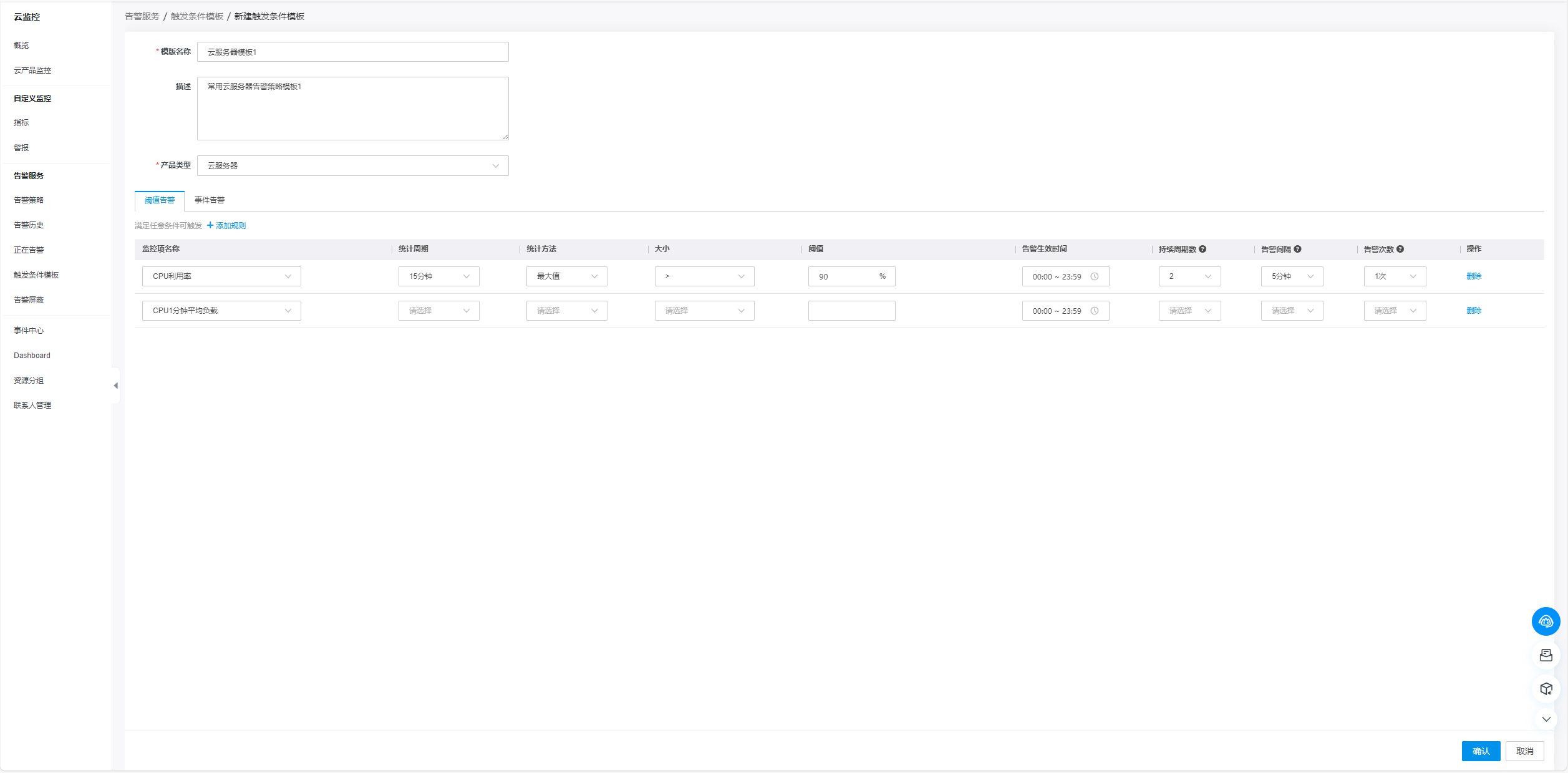 阈值告警分页中:仅需配置监控规则,无需选择实例。支持配置多个监控项,多条告警规则。
