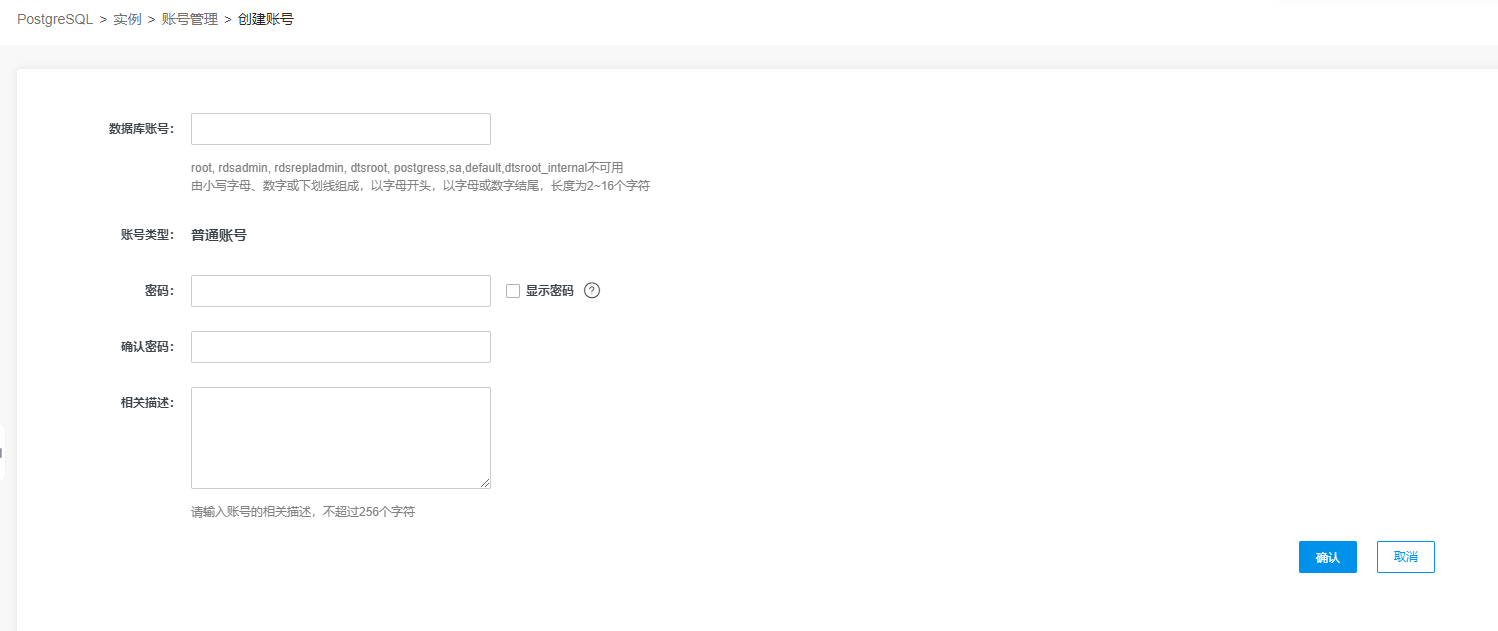 在PostgreSQL实例详情页左侧导航栏,点击账号管理,进入账号管理页面。
