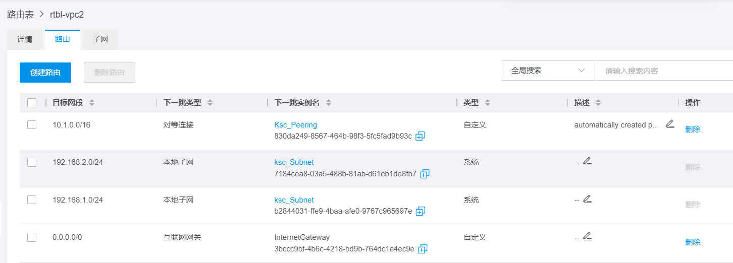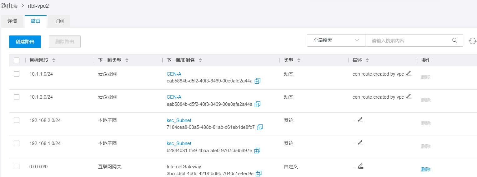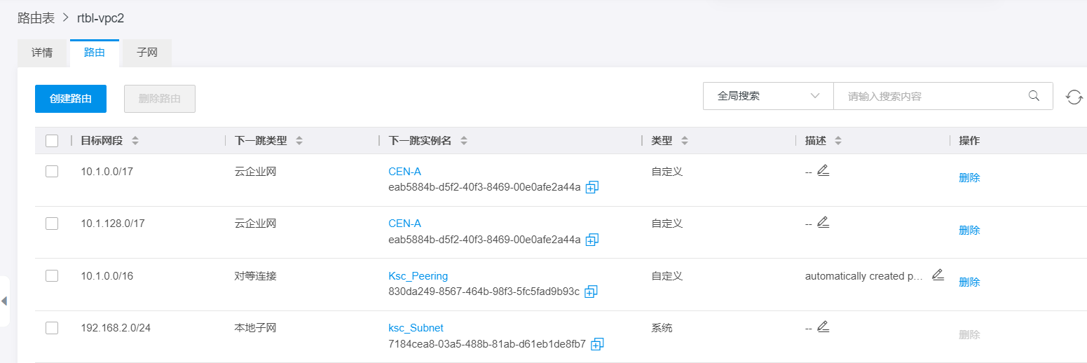 待流量从对等连接切换到云企业网实例后,可在路由表中将对等连接路由删除