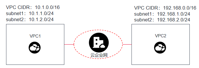 为简化组网,将VPC1和VPC2从对等连接切换到云企业网。