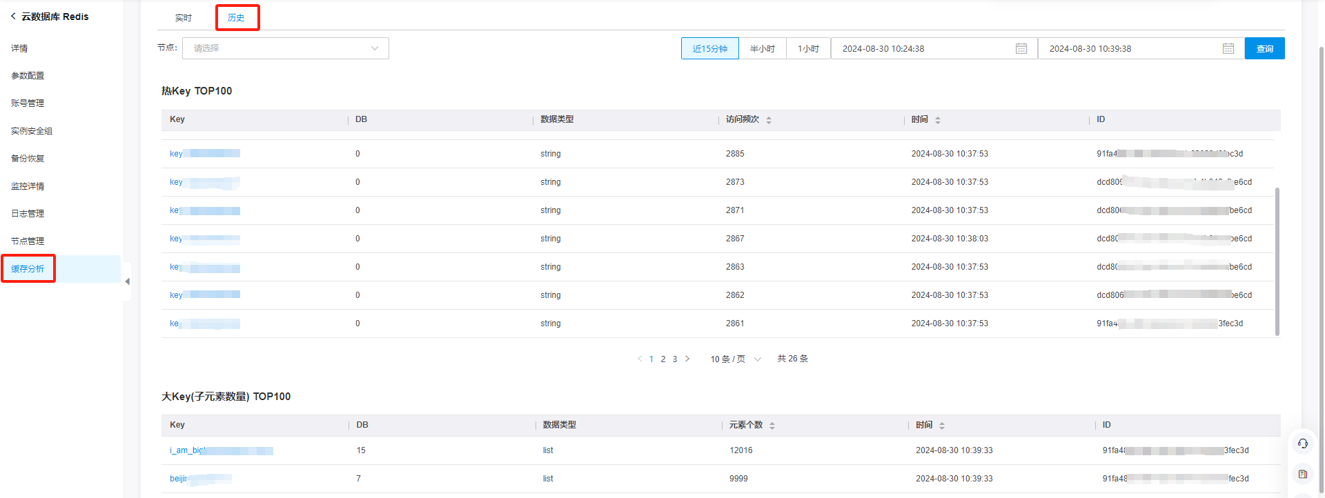 可支持查询近4天的历史热Key、大key信息,最大查询时间间隔小于、等于3小时。