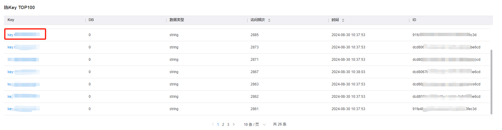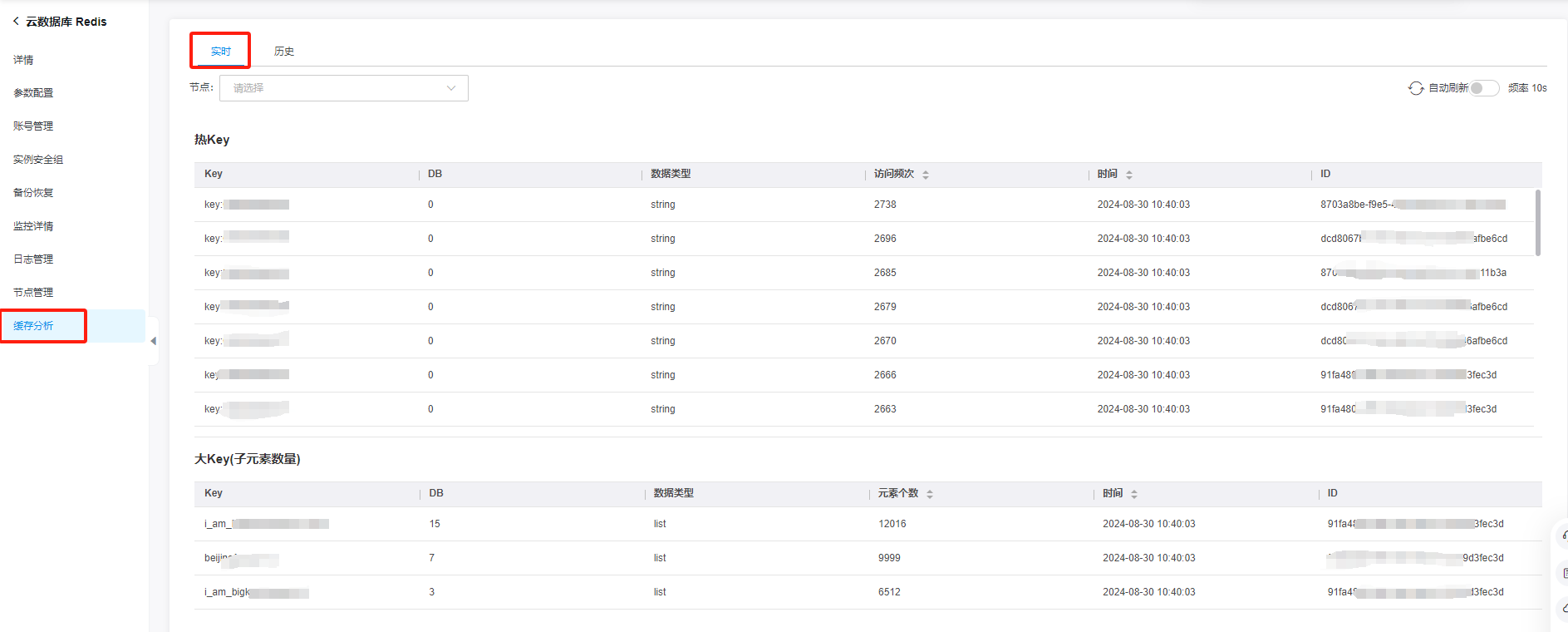 支持按照节点、实例进行筛选;点击刷新图标,立即刷新页面;也可开启自动刷新按钮,开启后每10秒刷新一次数据;查询结果支持按照访问频次、元素个数及时间进行排序。
