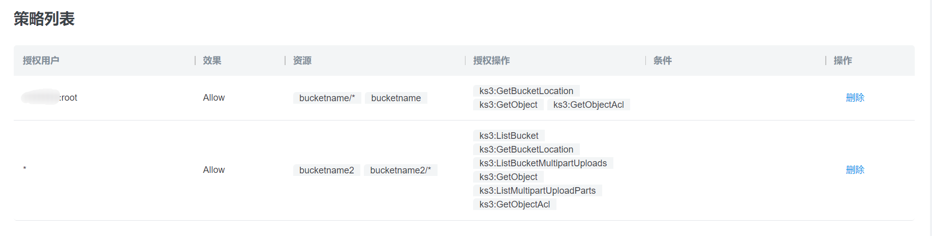 | | ks3:GetObject ks3:PutObject ks3:DeleteObject ks3:AbortMultipartUpload ks3:PostObjectRestore ks3:GetObjectAcl ks3:PutObjectAcl ks3:GetBucketLocation