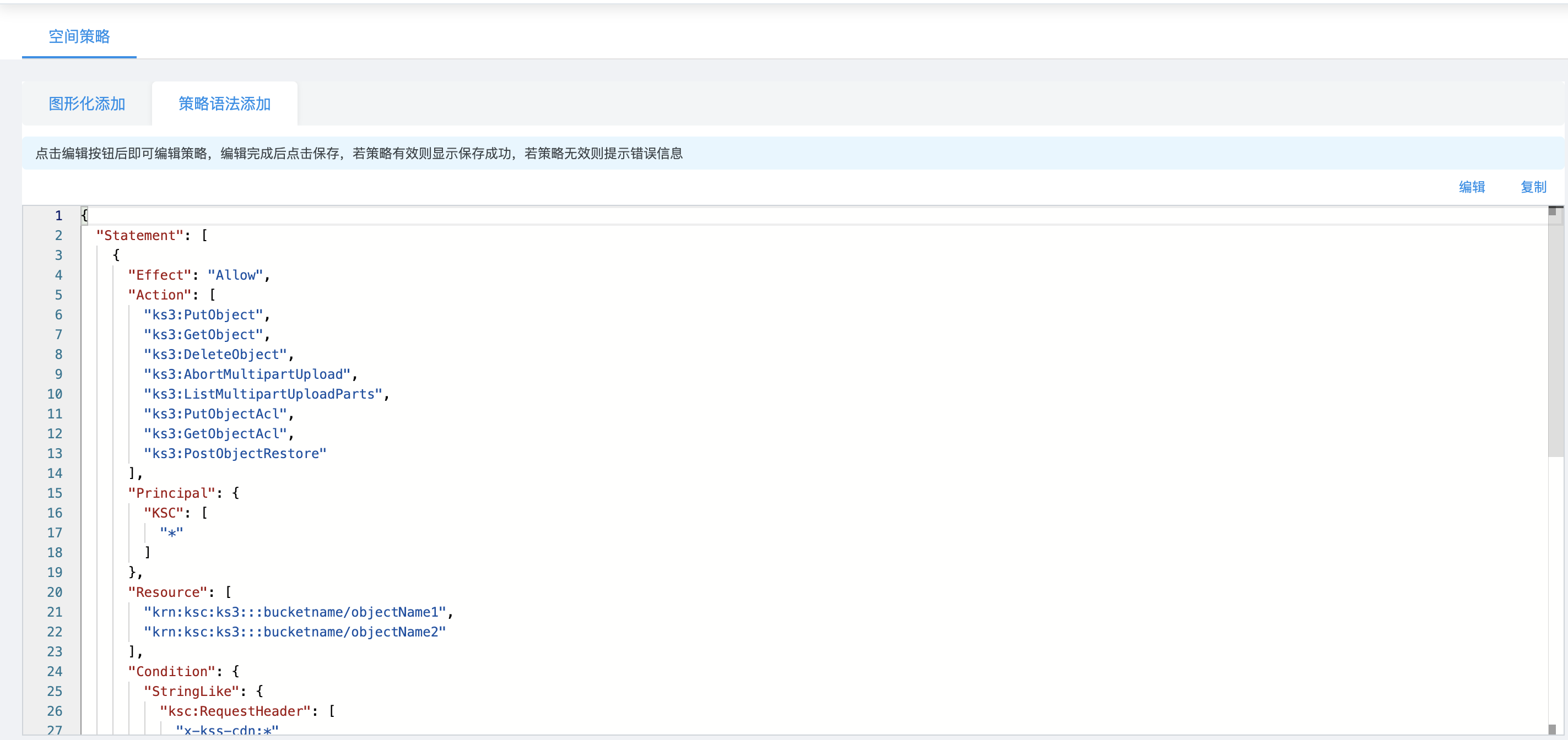 点击查看策略语法将展示JSON格式的策略。该工具支持多次生成策略,并且提供一键复制、一键清除、编辑策略的能力。