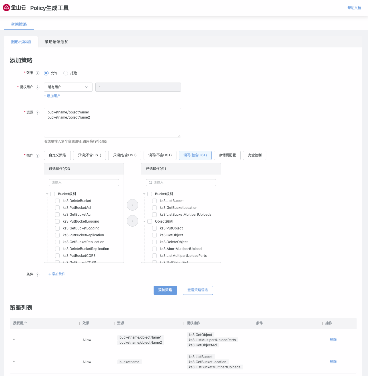 KS3 Policy策略生成工具是金山云对象存储KS3为用户提供的Web端工具,支持图形化配置,用户无需下载,即可在线使用。