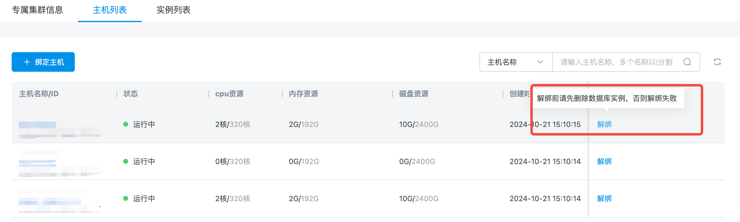 解绑前请先删除数据库实例,否则解绑可能会失败。为保证数据库的高可用,集群内请至少保留3台裸金属服务器。解绑后裸金属服务器仍会正常运行,如您希望删除裸金属服务器,请前往裸金属服务器控制台进行操作。